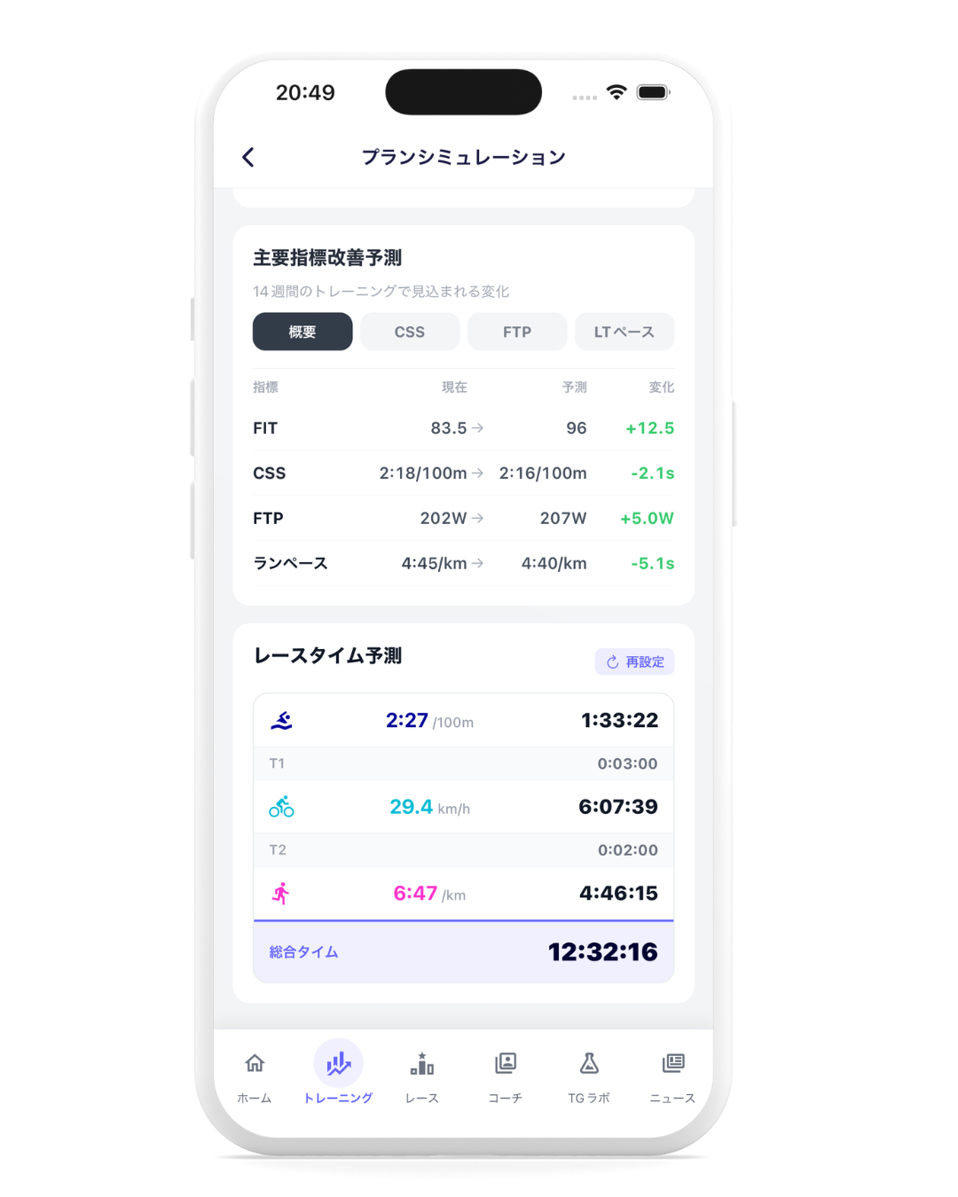 トレーニングを計画通り実施すると、パフォーマンス指標がどれだけ改善し、どのくらいのタイムで完走できるかを、運動生理学に基づく独自のアルゴリズムで予測を行う。