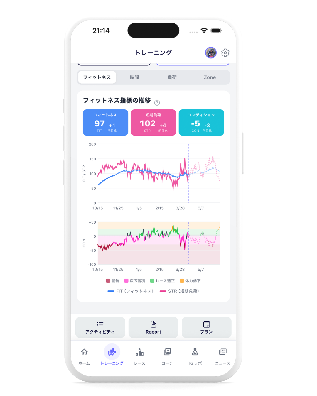 トレーニングの進捗確認とフィットネステストの結果を踏まえて、予測は更新される仕組み。