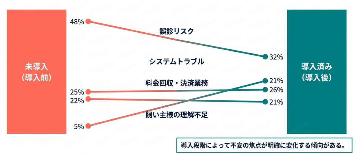 最も不安に感じる点についても「誤診リスク」が最多(導入済み32%、未導入48%)となっています 。