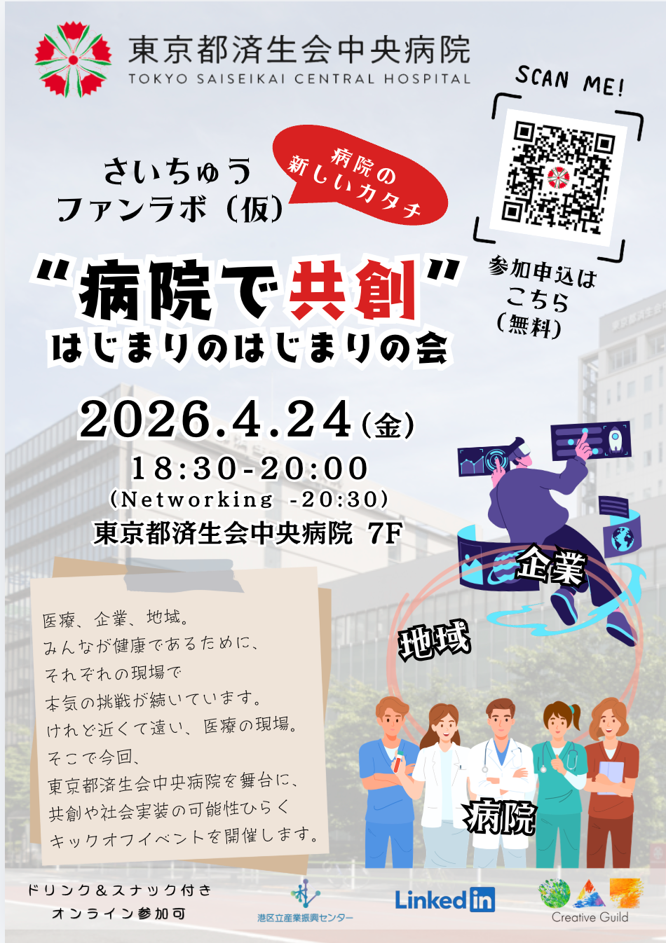 医療実装支援機構株式会社(本社:東京都品川区 代表取締役:横山 英理子、以下「当社」)は、2026年4月に東京都港区 済生会中央病院 と港区産業振興会と共にイベントを開催します。あわせて、東京都港区の済生会中央病院を拠点とした、医療・企業・地域をゆるやかにつなぐ実践コミュニティ「さいちゅう・ファンラボ」の企画・運営を開始することをお知らせいたします。