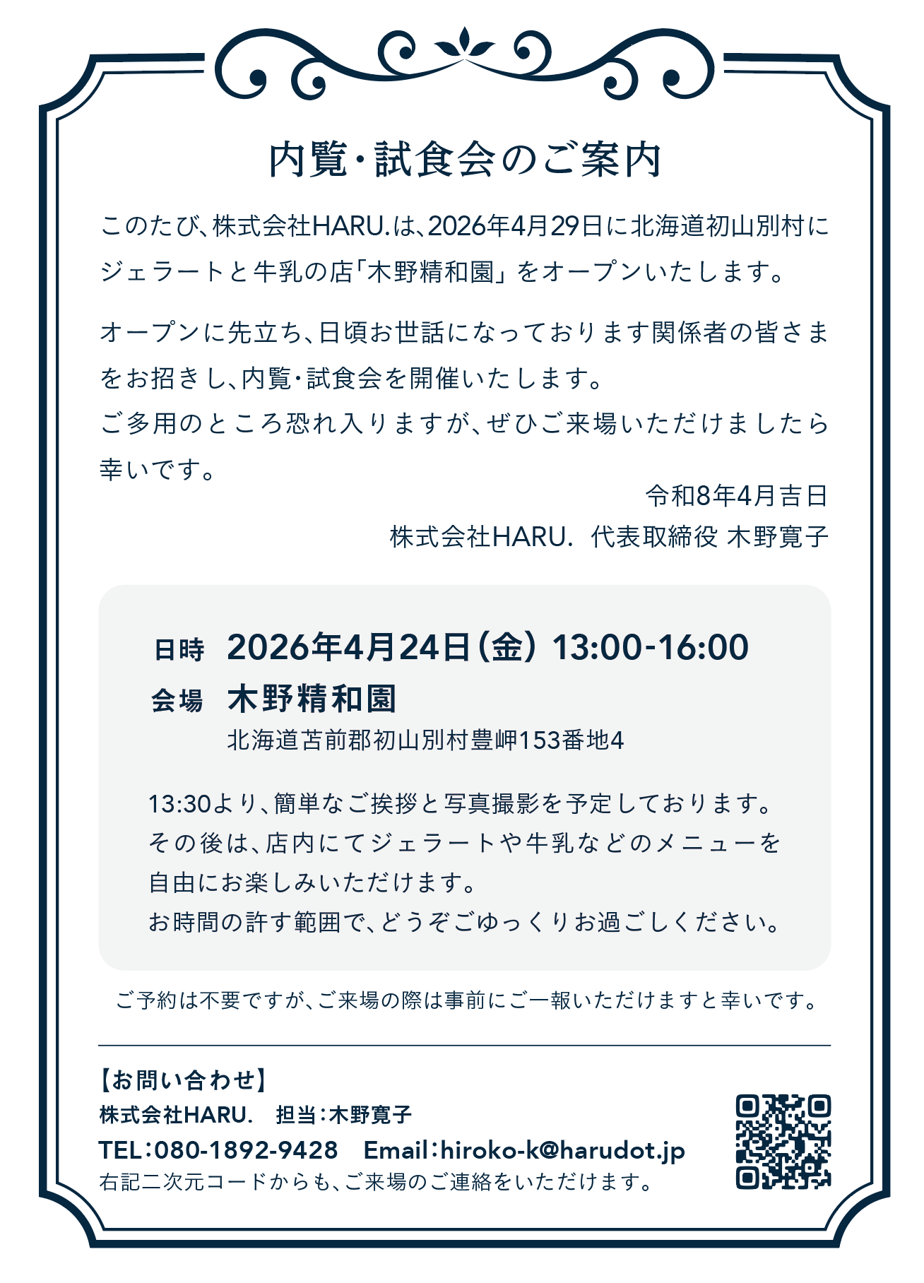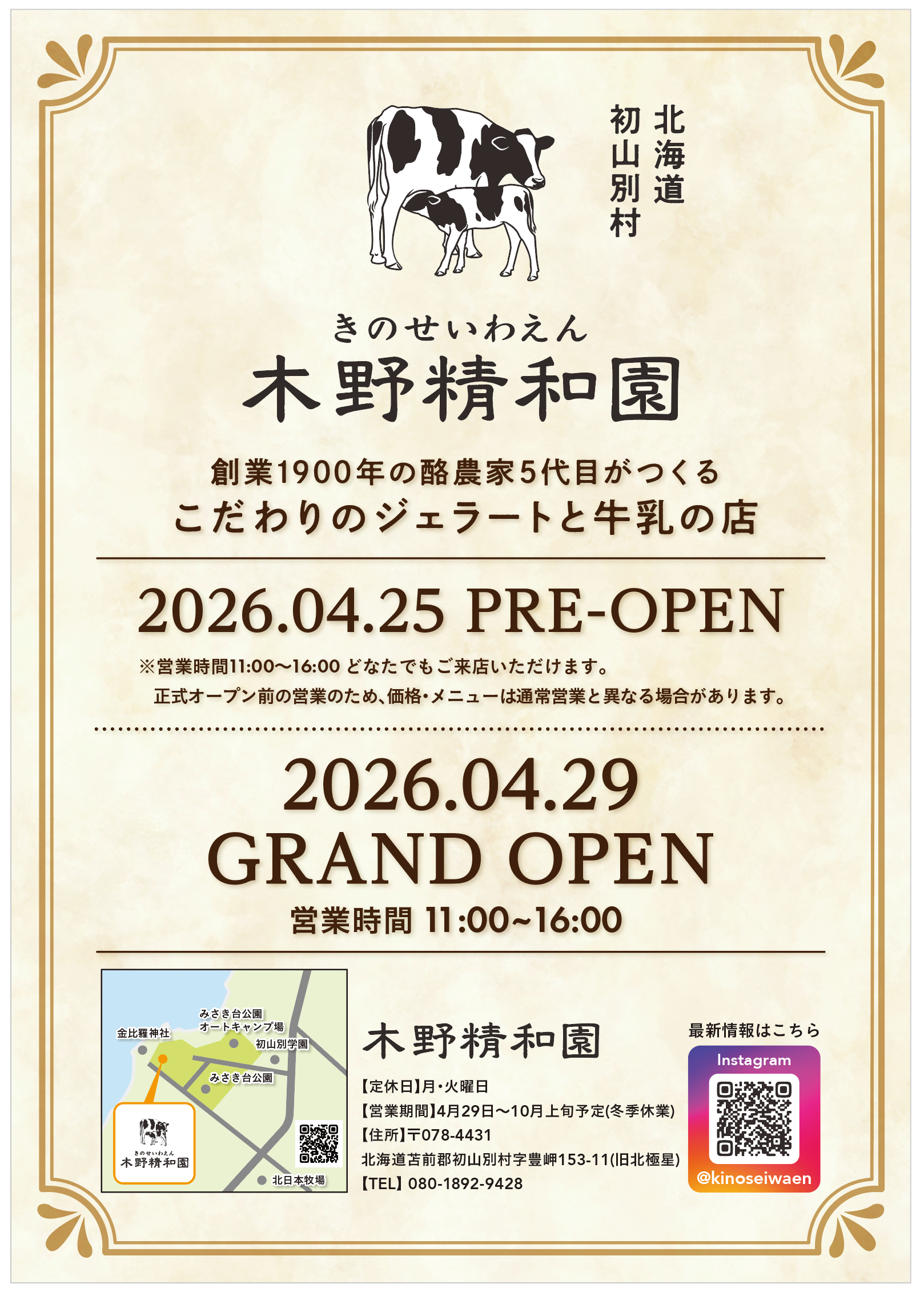 株式会社HARU.(北海道苫前郡初山別村、代表取締役:木野寛子)は、2026年4月29日(水・祝)、北海道苫前郡初山別村にジェラート・牛乳の店「木野精和園(きのせいわえん)」をオープンします。初山別で酪農を営む北日本牧場の生乳を使い、ジェラートと牛乳を提供します。