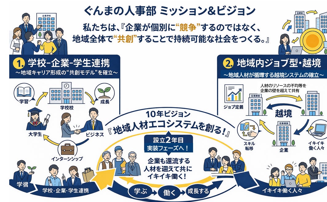 この度、一般社団法人ぐんまの人事部(代表理事:薗田直子)は、10年後の“地域人材エコシステム”の構築に向けて、新事業計画を策定しました。