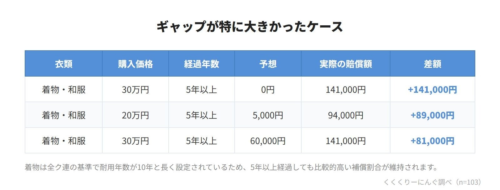 着物は全ク連の基準で耐用年数が10年と長く設定されているため、5年以上経過しても比較的高い補償割合が維持されます。しかし消費者の多くはこの仕組みを知らず、「古い服はもう返ってこない」と諦めている傾向がうかがえます。
