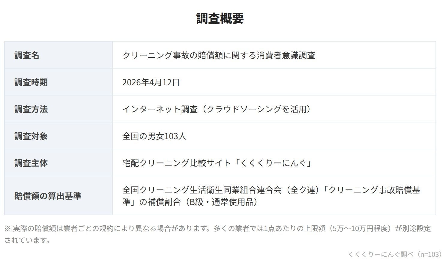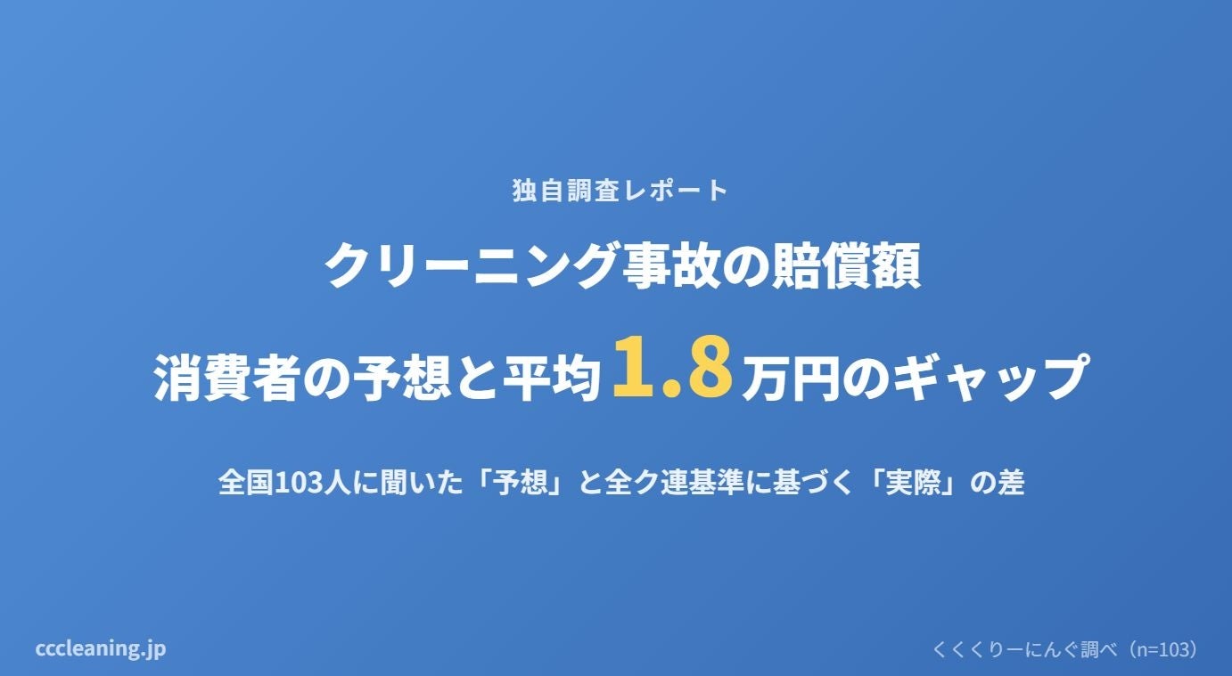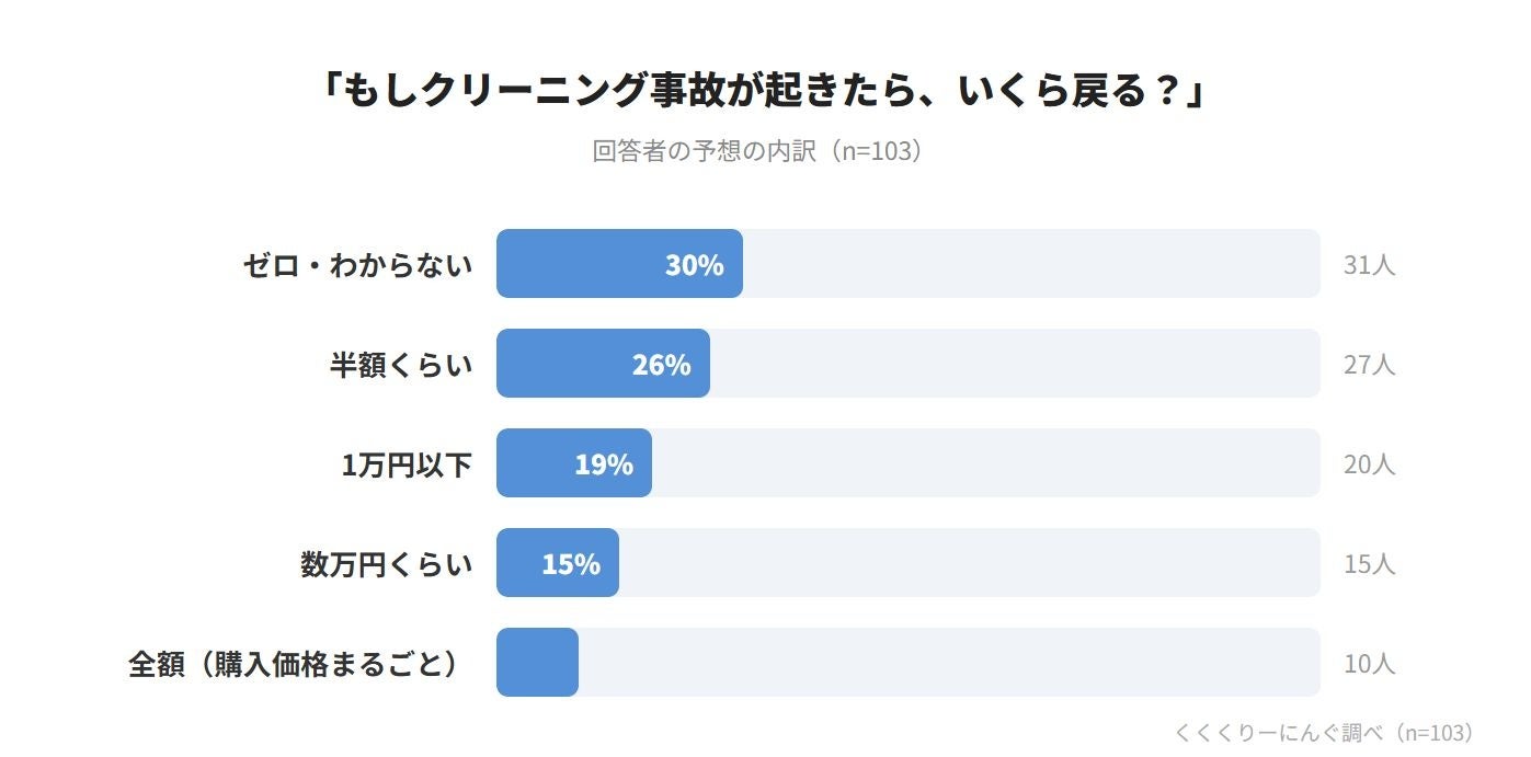 宅配クリーニング比較サイト「くくくりーにんぐ」(https://cccleaning.jp)は、クリーニング事故が起きた場合の賠償額に関する消費者意識調査を実施しました。全国の男女103人を対象に「自分の一番高い服がクリーニング事故に遭ったら、いくら返ってくると思うか」を尋ね、全ク連(全国クリーニング生活衛生同業組合連合会)の賠償基準に基づく実際の賠償額との差を調べました。