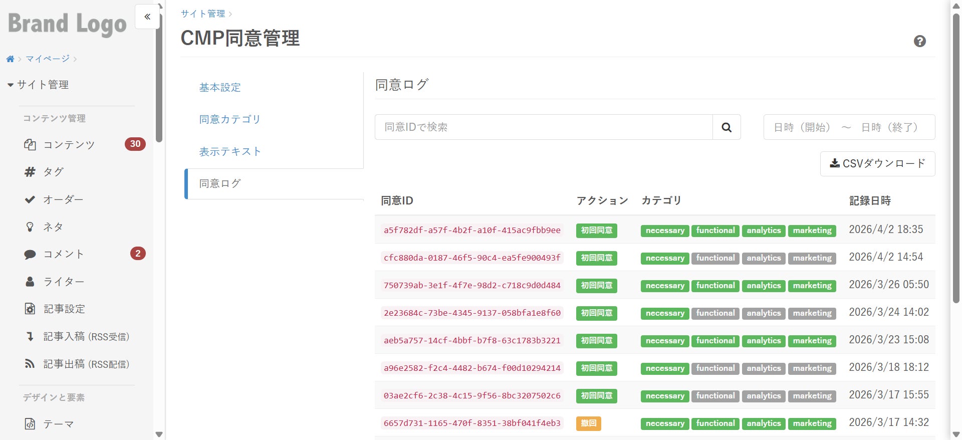 同意取得の履歴確認や履歴のCSVダウンロードなどをClipkitの管理画面から一括で行うことができます。