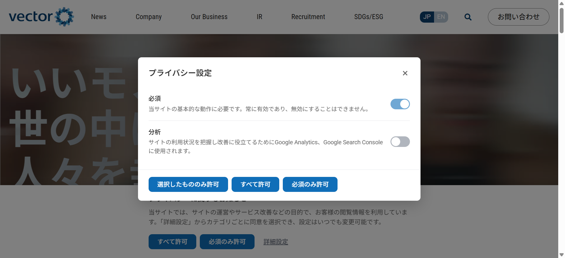 データの収集目的や利用先のツールを明示し、ユーザーが「許可」または「拒否」を選択できるバナーを表示します。欧州のGDPRや国内の改正電気通信事業法(外部送信規律)が求める、情報の透明性とユーザーの選択権の確保をサポートします。