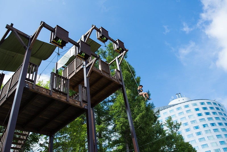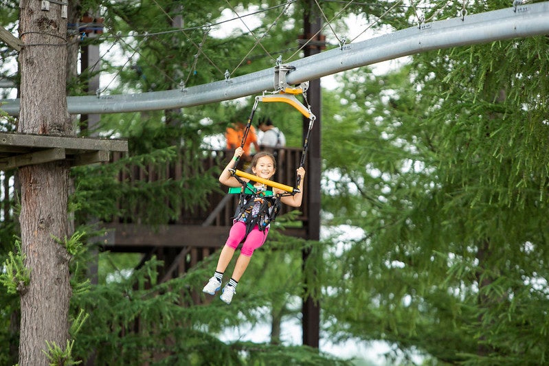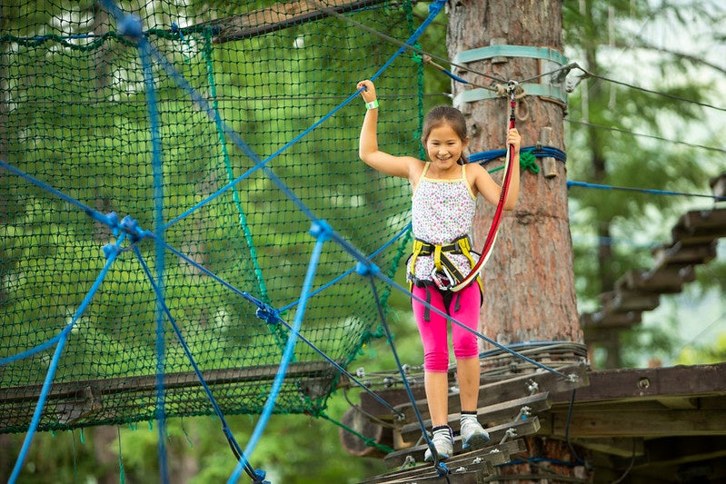 樹上の冒険を楽しもう!木から木へと吊り橋やロープを渡ったり、滑車の付いたワイヤーにぶら下がって空中飛行などお楽しみいただけます。