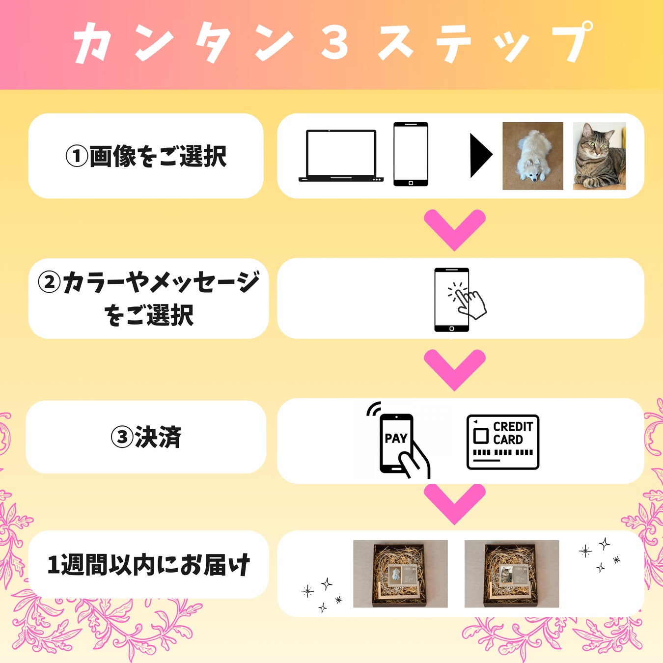 2. 名前・メッセージ・日付を自由にカスタマイズ可能 「Momo」「Sora」といったお名前はもちろん、「いつも笑顔にしてくれてありがとう」といったメッセージや、お誕生日、お迎えした記念日などを自由に配置できます。