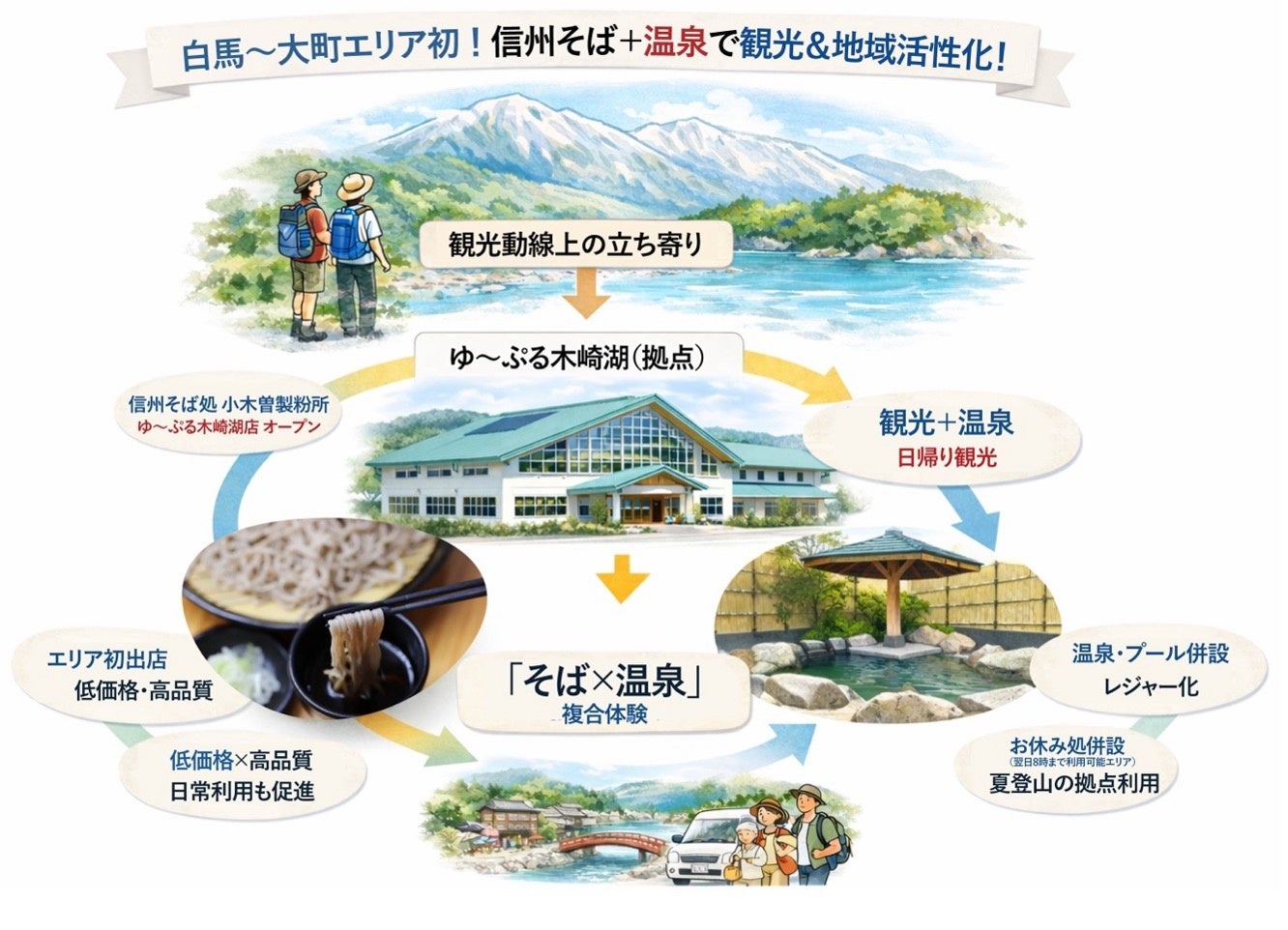 長野県大町市の温浴・観光施設「ゆ〜ぷる木崎湖」を運営する木崎湖温泉開発株式会社は、2026年4月24日、「信州そば 小木曽製粉所 ゆ〜ぷる木崎湖店」を新規オープンいたします。当施設は木崎湖畔に位置し、これまで日帰り温泉施設として地域住民や観光客に親しまれてきました。今回の出店により、温泉に加えて“気軽に楽しめる本格信州そば”を提供し、食事と癒しを一体で楽しめる観光拠点としての魅力向上を図ります。