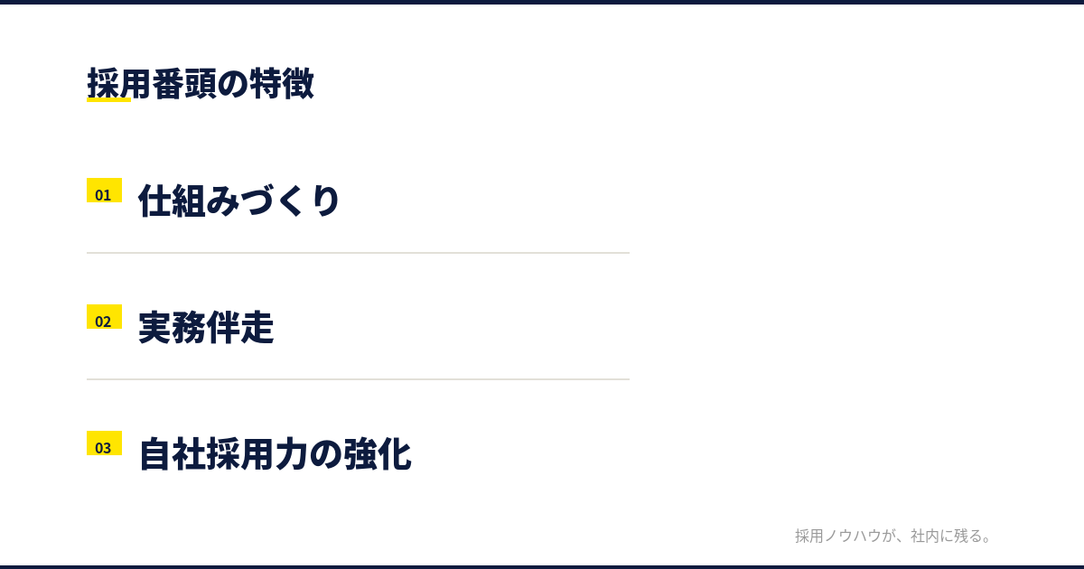 また、企業の状況に応じて必要な実務もサポートしつつ、最終的には採用の進め方や判断軸、運用ノウハウが社内に残る状態を目指します。