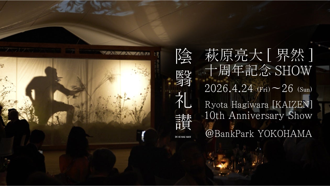 華道家として活動を開始し、すでに10年。その節目を記念し、萩原亮大(はぎわら りょうた)は、2026年4月24日(金)から26日(日)の3日間、横浜のBankPark YOKOHAMAにて、自身のキャリア史上最大規模となる花いけイベント「陰翳礼讃(いんえいらいさん)」を、来年2027年に国際園芸博覧会(International Horticultural Expo 2027, Yokohama, Japan)の開催を控える横浜市の新名所、BankParkで行います。(主催:株式会社CRAFTING JAPAN/萩原 亮大)