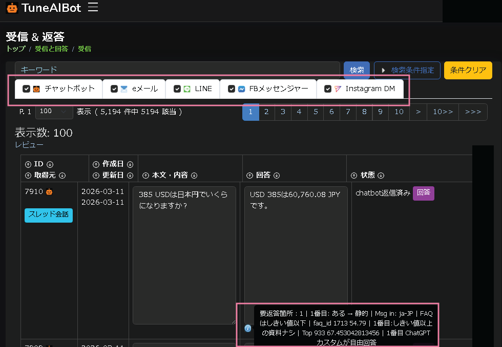 TuneAIBotは、問い合わせを一つのAIで「受信・回答作成・送信」までを統合的に処理するための業界専用型AIプラットフォームです。