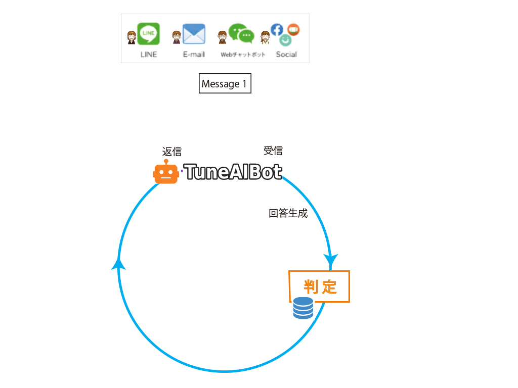 TuneAIBotはChatGPTを会社専用モデルを用意し、商品情報、FAQ、業務ルールを教育し、コミュニケーションチャンネル(LINE、メール、SNSなど)への送受信をAIに実行するAIプラットフォームです。日々の問合せの対応をナレッジ化していくことで、知的資産(アセット)となり、自動応答率が上がっていきます。
