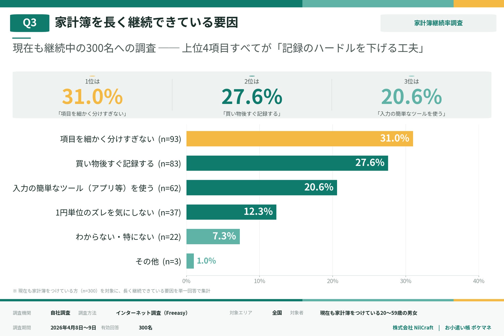 挫折者の理由として最多だった「習慣が定着しなかった」(30.0%)と、継続者の秘訣として最多だった「項目を細かく分けすぎない」(31.0%)は、表裏一体の関係にあるといえそうです。家計簿を続けられるかどうかを分けているのは、性格や意志の強さではなく、「いかに記録を負担のない習慣として定着させられるか」という工夫の有無なのかもしれません。