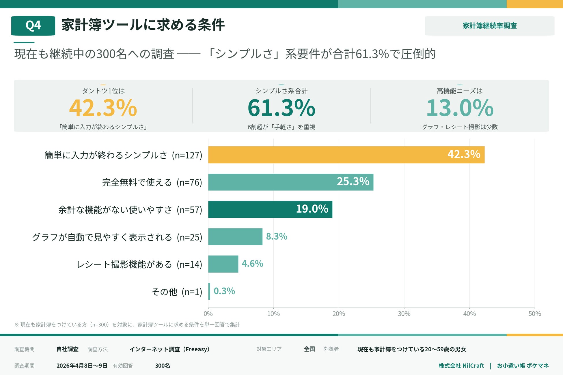 最も多く選ばれた条件は「簡単に入力が終わるシンプルさ」で42.3%(127名)となり、2位以下を大きく引き離す結果となりました。続いて「完全無料で使える」が25.3%(76名)、「余計な機能がない使いやすさ」が19.0%(57名)、「グラフが自動で見やすく表示される」が8.3%(25名)、「レシート撮影機能がある」が4.6%(14名)となっています。