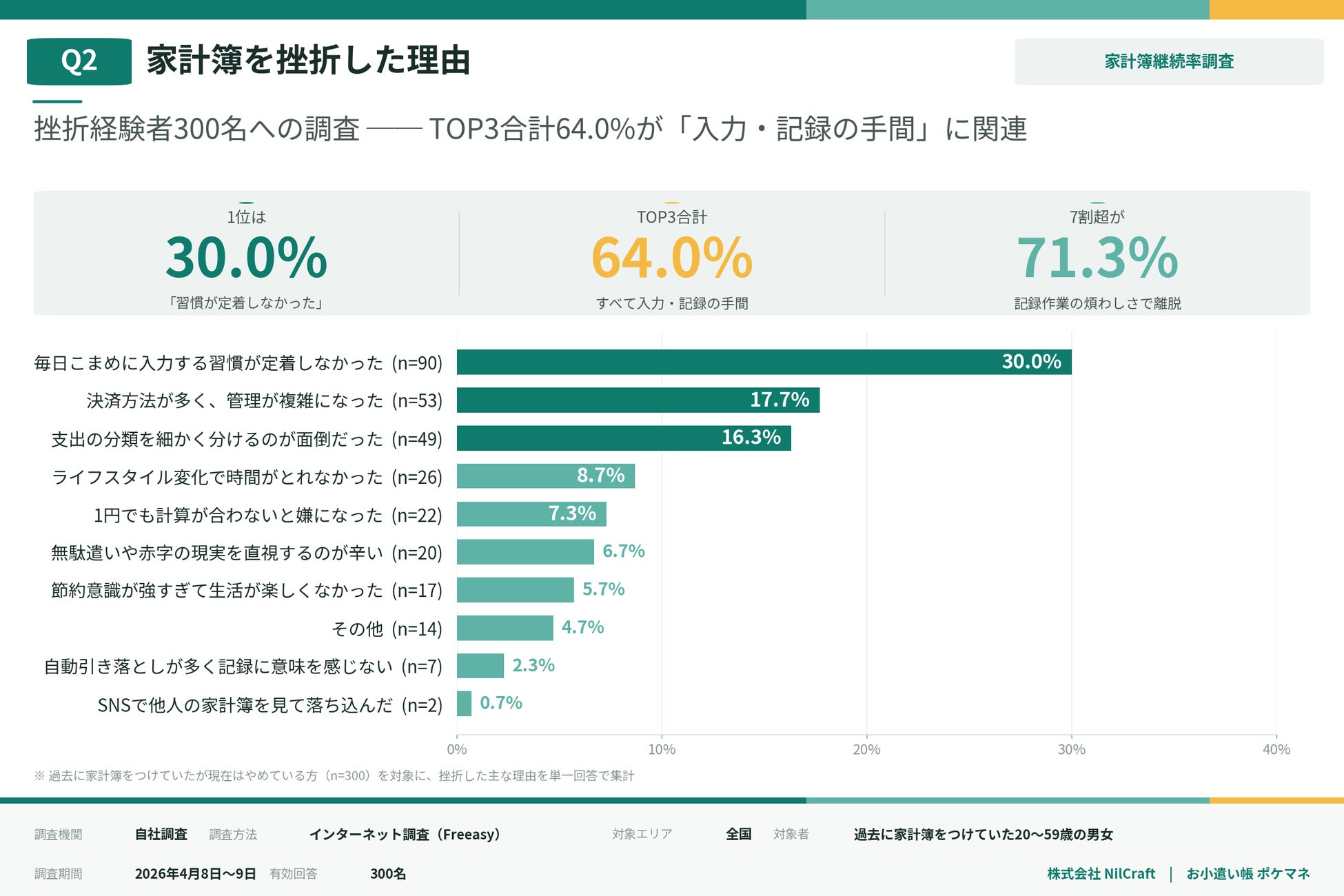 注目すべきは、上位3項目がいずれも入力・記録の手間に関連しているという点です。これら3つを合計すると64.0%に達し、さらに「1円でも計算が合わないと、すべてが嫌になってしまった」(7.3%)まで含めると、実に71.3%が「記録作業そのものの煩わしさ」を理由に家計簿を離脱していることがわかります。