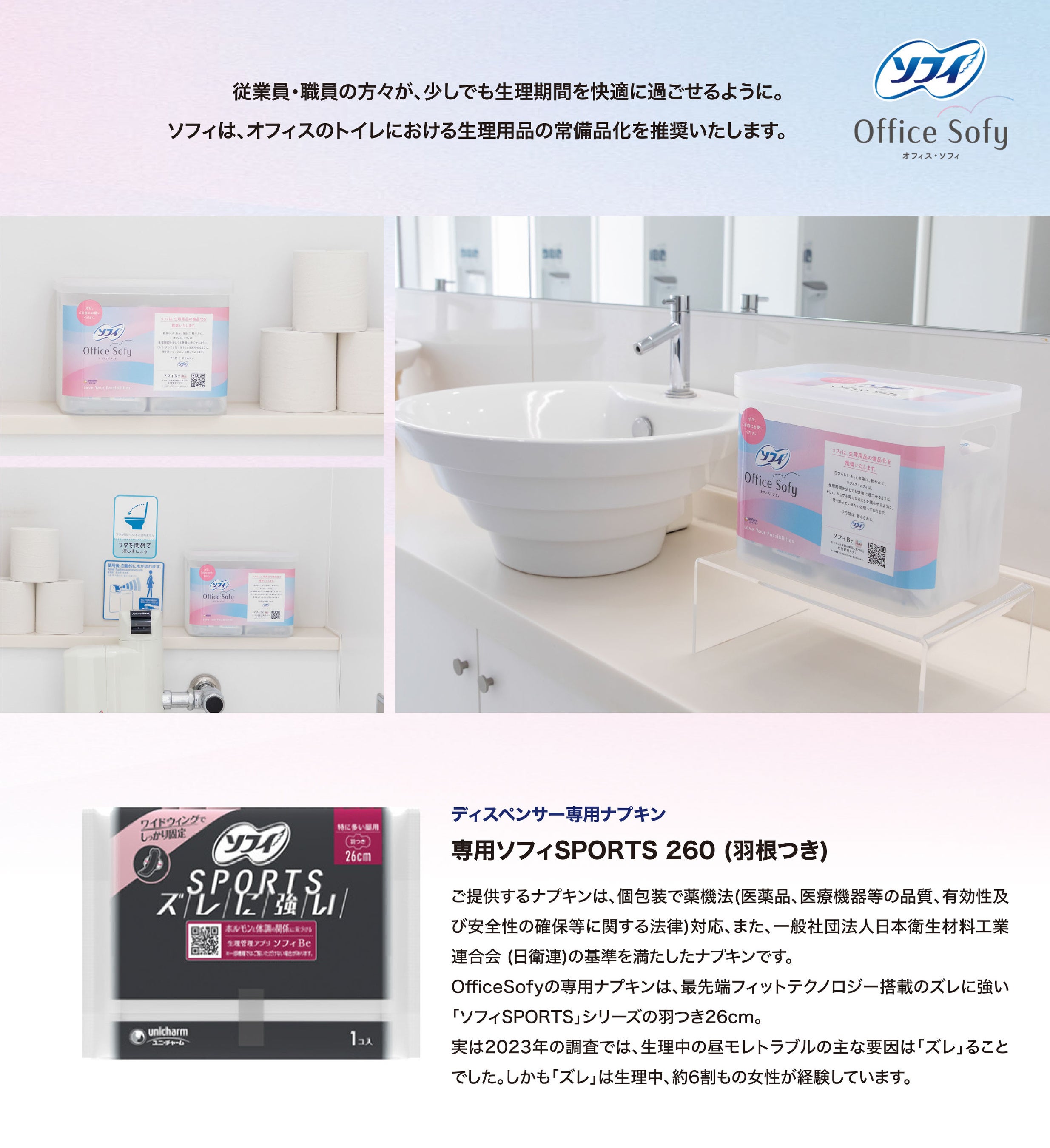 株式会社ビー・エイチ(代表取締役:所田 貴行)は、ユニ・チャーム株式会社(代表取締役 社長執行役員:高原 豪久)およびNPO法人レッドボックスジャパン(代表理事:尾熊 栞奈)と連携し、『どこでもソフィ』プロジェクトの一環として、美容サロン・クリニック向けに「Office Sofy」の提供を開始いたします。