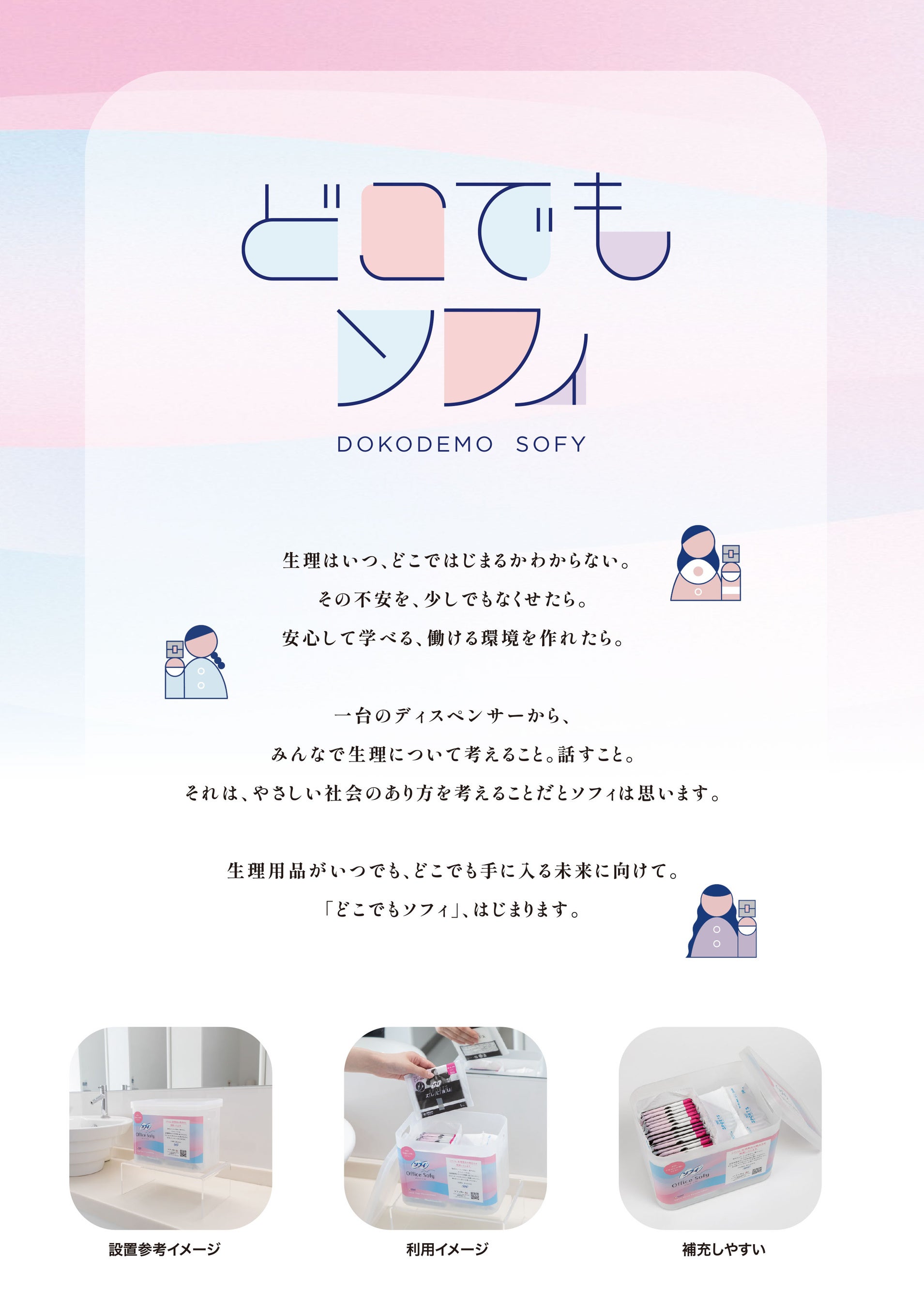 『どこでもソフィ』は、学校向けの「School Sofy」と企業向けの「Office Sofy」の2種類の生理用ナプキンディスペンサーを無償で提供※し、必要な時にいつでも衛生的なナプキンを入手できる環境を整備する取り組みです。中に補充するナプキンは、設置先の学校・企業にご購入いただきます。