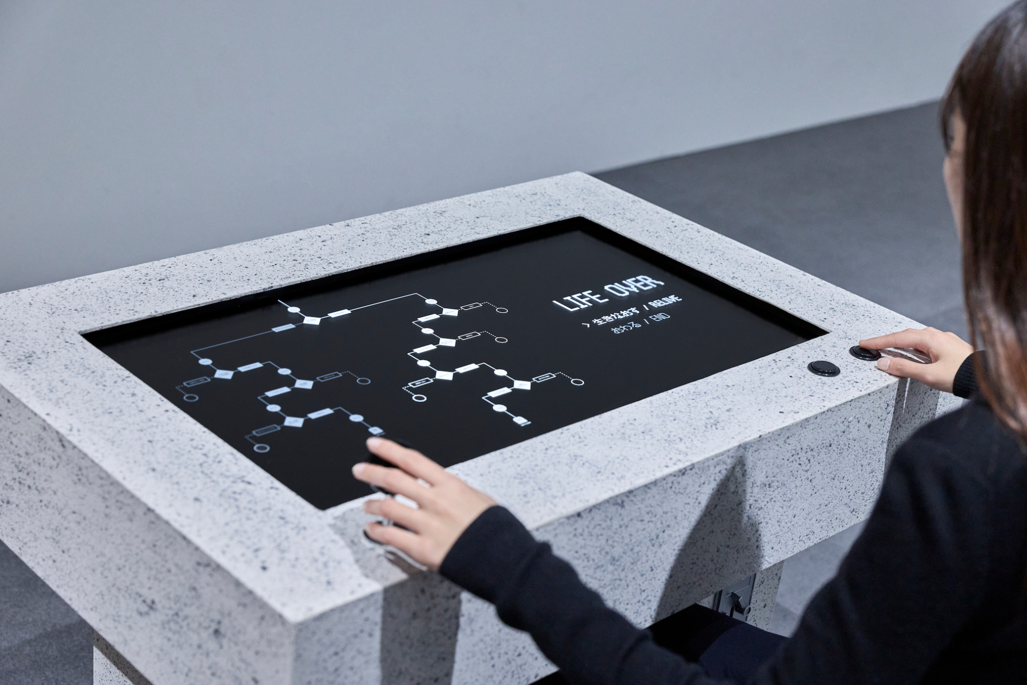 《ありうる人生たちのゲーム / Game of Possible Lives》は、ある個人の人生の選択を始まりから終わりまで行う作品です。プレイヤーはその個人の人生における結婚、キャリア、家族といった大きな岐路で選択を重ね、その決断がもたらす結果を最期まで体験します。ゲーム内の出来事の文章は、筐体内でローカルに稼働する大規模言語モデル(AI)が、統計データを参照しながらリアルタイムに生成しています。社会の膨大なテキストデータによって作られる大規模言語モデルが生成する世界は、不条理や偏見も含めて現実社会の反映となり、この時代を生きるということの「体験的なアーカイブ」として機能します。