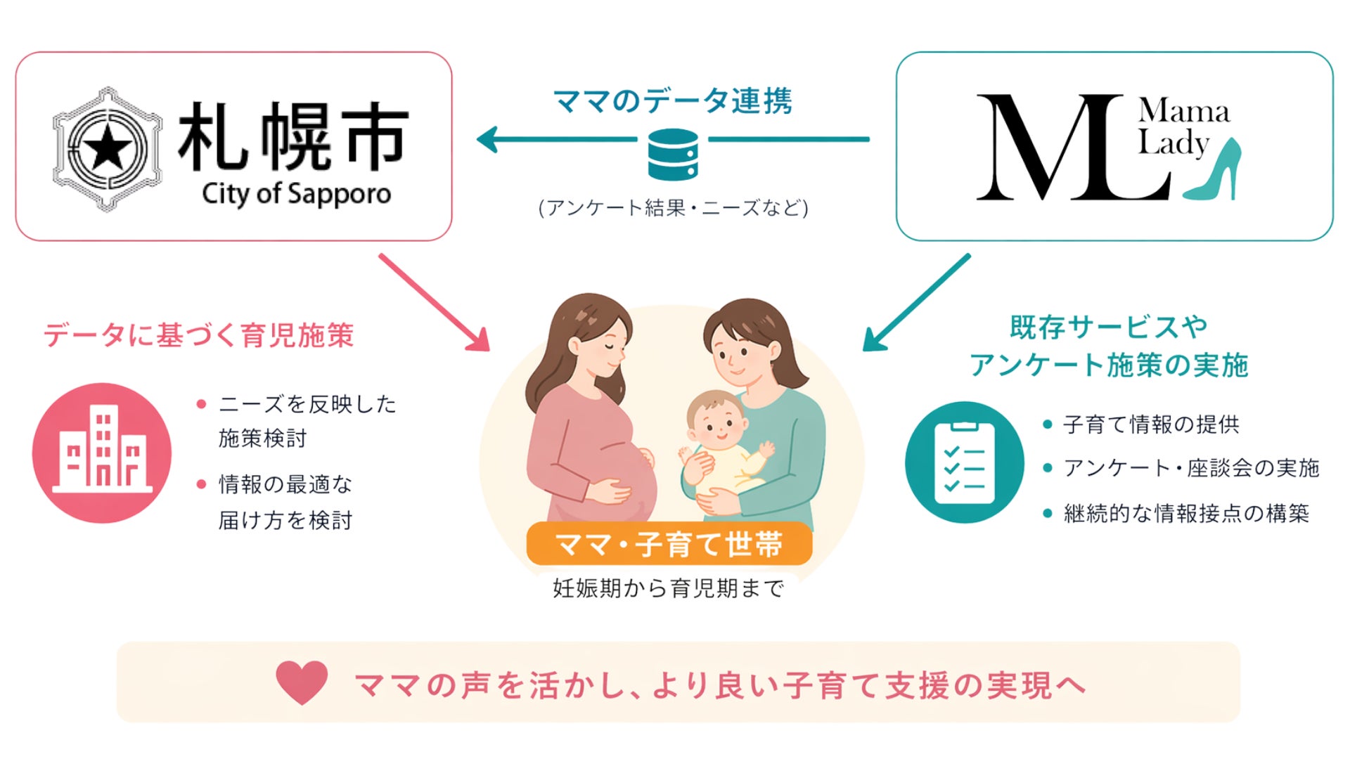 株式会社MamaLadyは札幌市と連携し、株式会社MamaLadyが有する妊娠期から育児期までの継続的な情報接点を活用し、子育て支援に係る広報や、政策立案に関する連携に取り組みます。
