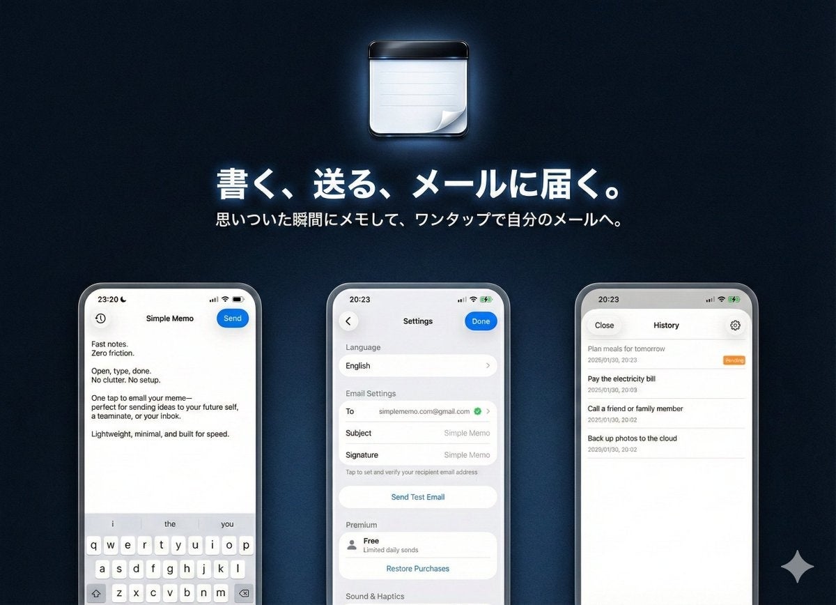 「起動して、書いて、送る」だけ。かつて支持された自分宛メールのメモワークフローを、iPhoneで使いやすいかたちで復活させました。