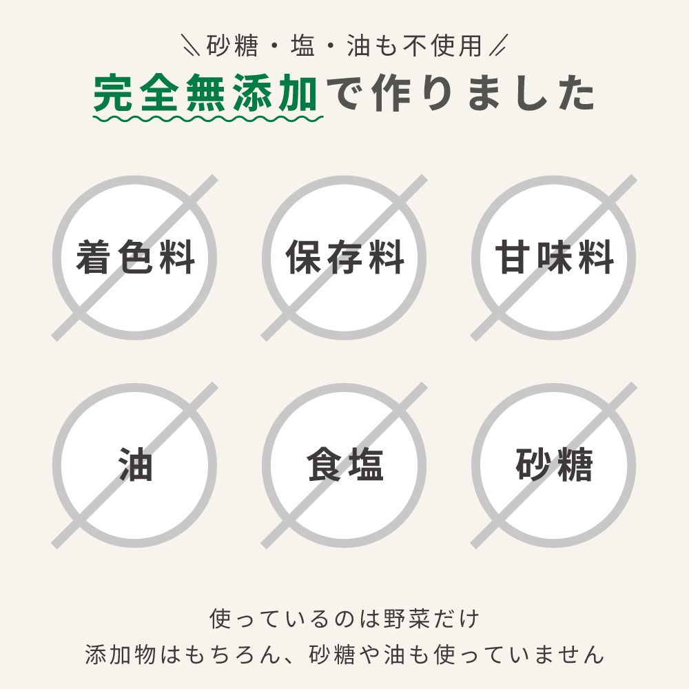 添加物、食塩、砂糖、油など、野菜以外のものは一切使用しておりません。