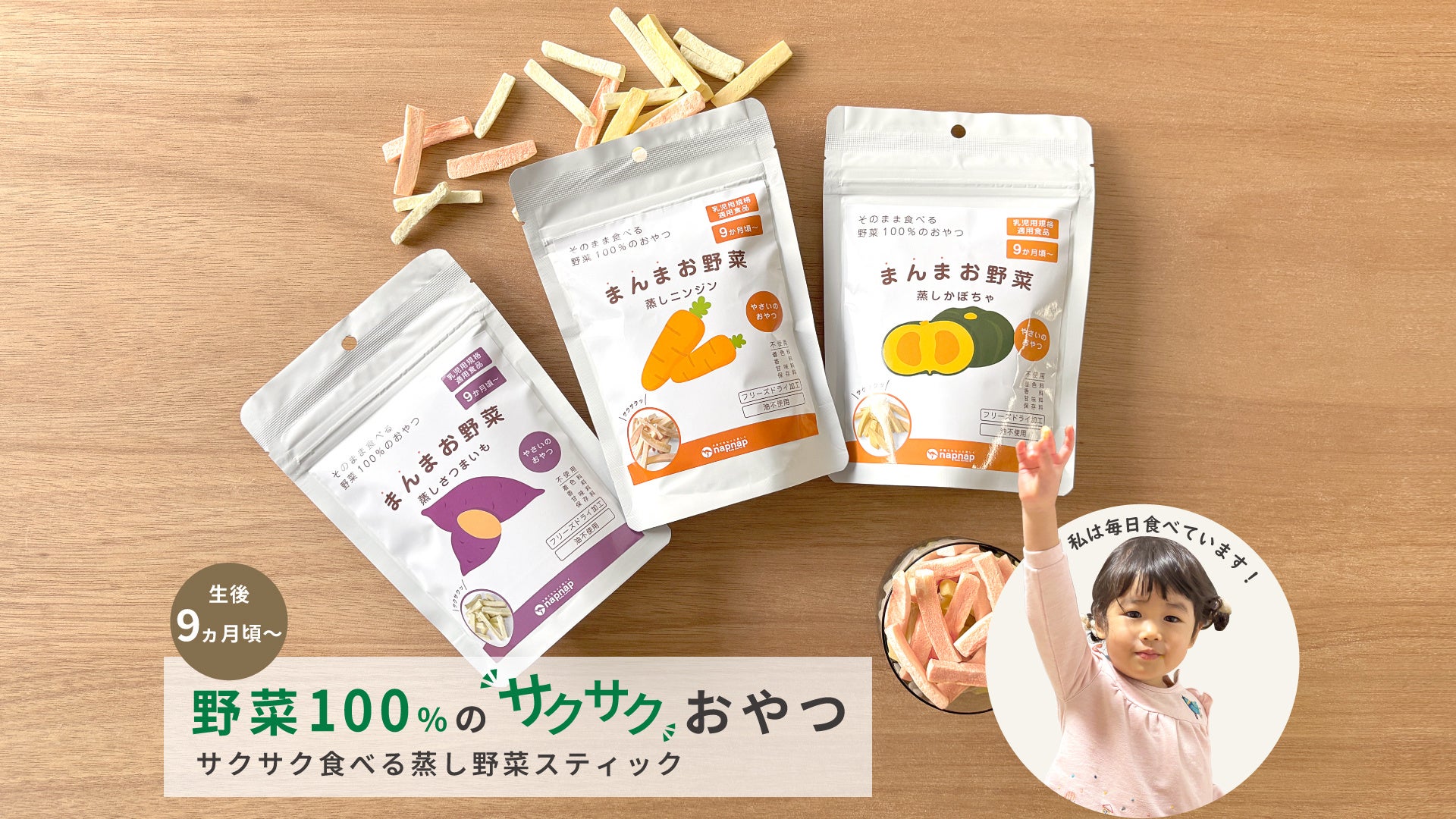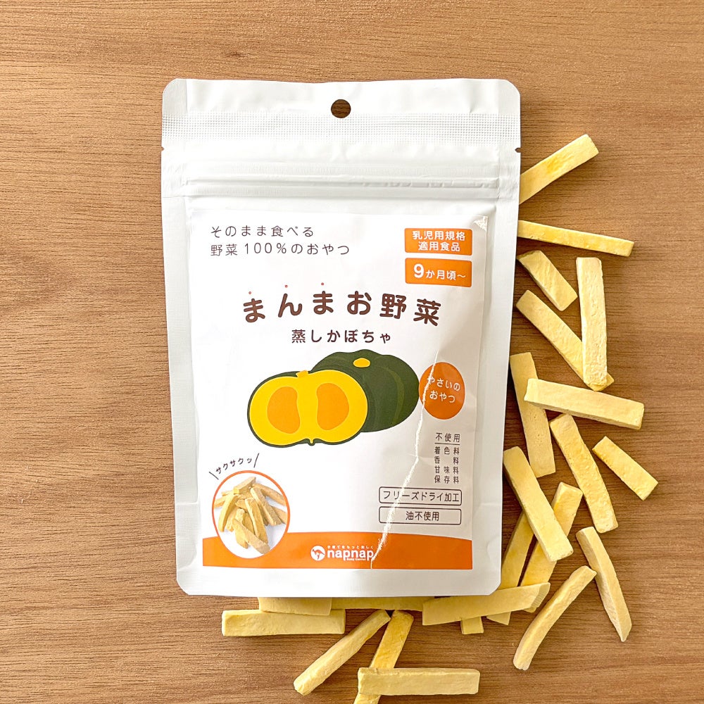 『株式会社ナップナップ』は、野菜100%のおやつ【まんまお野菜】を発売しました。全国のバースデイ(2026年2月末時点:343店舗)、公式通販サイト(楽天市場、Amazonなど)で販売いたします。