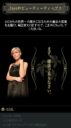 書籍も出版し反響を呼んでいる「イネス・リグロンの美のノウハウ」が携帯サイトでも展開され、普段は見ることができないレッスン動画や大会中の衣装・水着などのゴージャスなプレミアム待受け画像など、下記に記しますような様々なコンテンツをいつでもどこでも手に入れることができます。さらには携帯サイトを利用した投票企画や日本最終選考会でのユーザー連動などリアルなイベントとの連携も予定しております。
