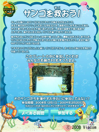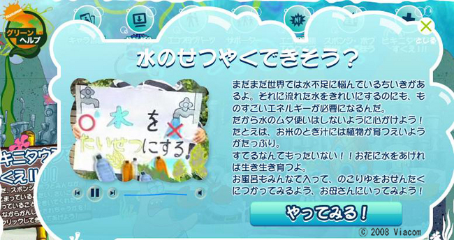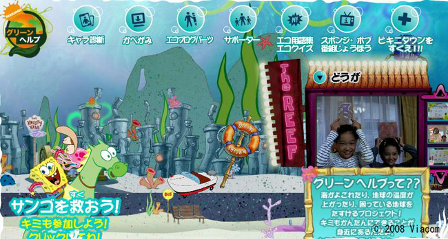 ニコロデオンの人気アニメ「スポンジ・ボブ」が住むビキニタウンを舞台に、汚れた町をキレイにしながら、地球が抱える問題を知り、簡単に出来るエコ活動動画なども見ることが出来る、ゲーム感覚で楽しくエコを学べる仕組みのサイト。エコ活動を行なうと、「スポンジ・ボブ」からオリジナルの感謝状がもらえます。