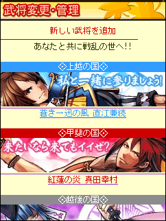 ゲームに登場する直江兼続、真田幸村、上杉謙信、織田信長のそれぞれの武将の