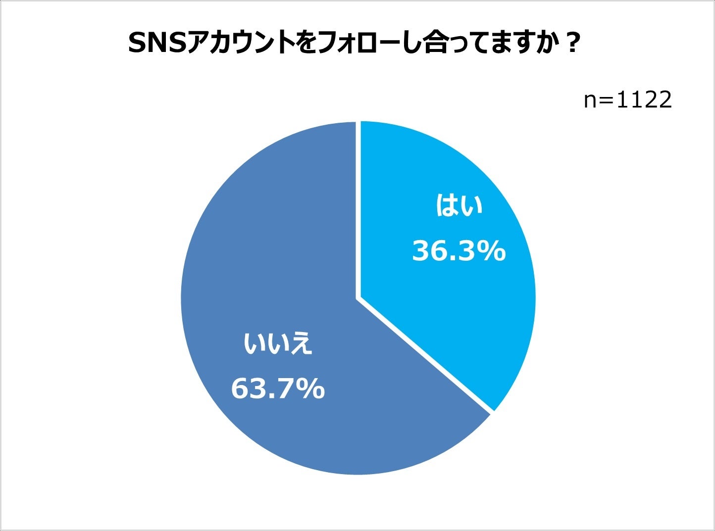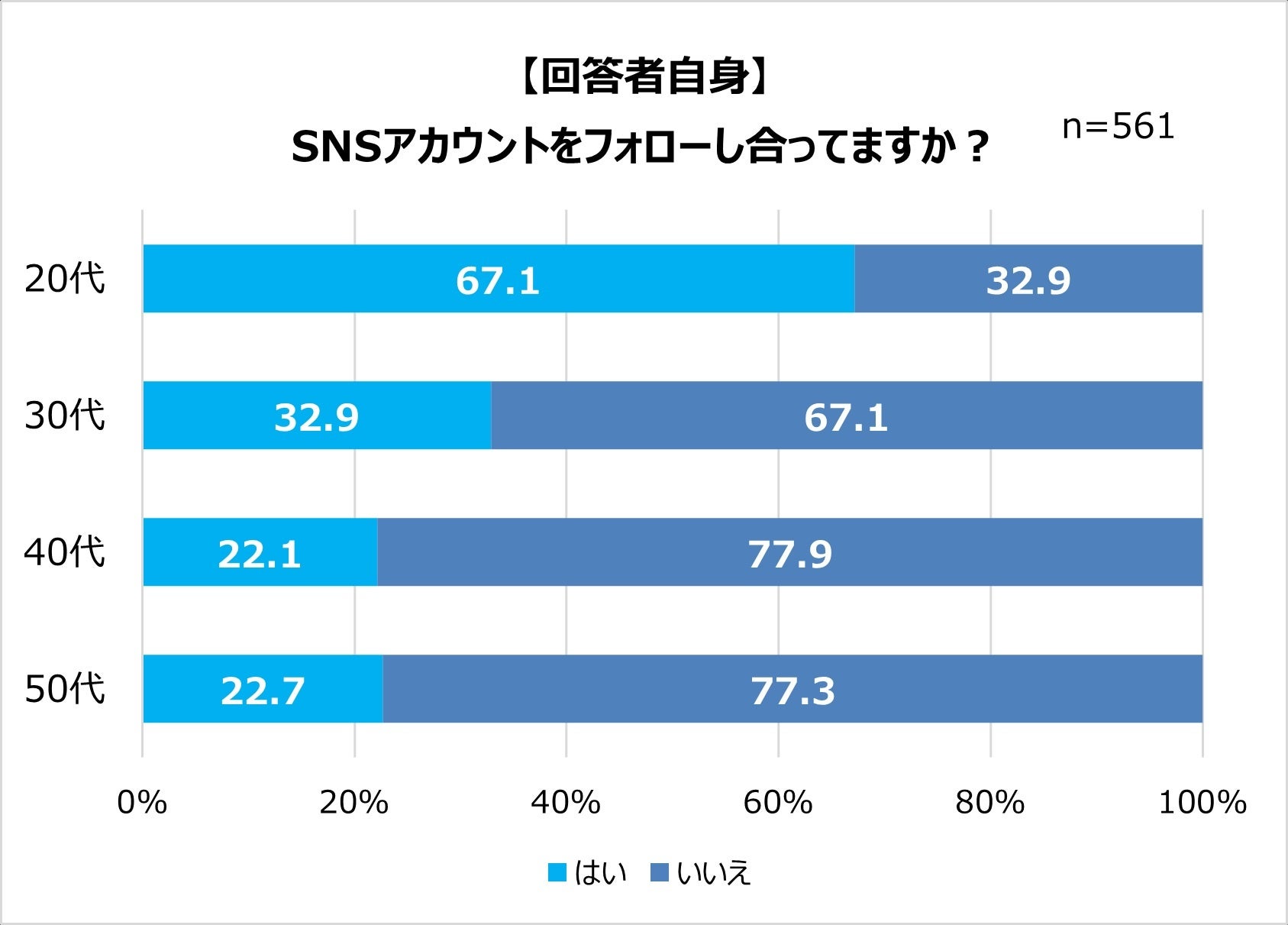 SNSアカウントをフォローし合っているかについて聞いた質問では、「はい」と回答した人は全体で36.3%と少数派でした。一方で、回答者自身の結果を年代別に見ると、40代、50代は約2割と少ないのに対し、20代は約7割の人が相互フォローしていることが分かりました。