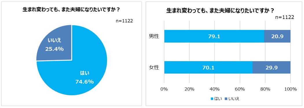 続いて、生まれ変わってもまた夫婦になりたいかを調べると、全体の7割以上が「はい(74.6%)」と回答。男女別にみると、「はい」と回答した人は、男性は79.1%、女性は70.1%と、男性が女性よりも9%高い結果に。しかし、逆に言えば男性の約2割、女性の約3割は「また夫婦になりたくない」と考えていることも明らかになりました。