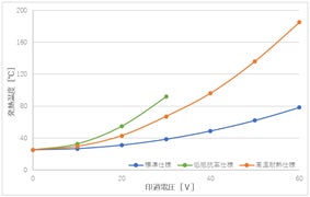 「低抵抗率仕様」は、「標準仕様」の表面抵抗率が150Ω/□であるのに対し、30Ω/□にすることで同じ印加電圧ではより広い面積で、同じ面積ではより低い印加電圧で発熱することが可能です。自動車市場やモバイル機器市場など幅広い分野で利用可能です。