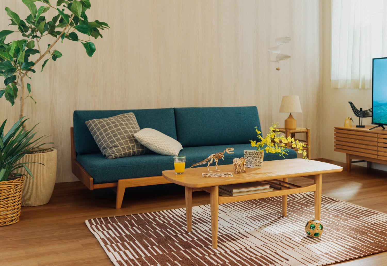 脚部のデザインと、木のぬくもりを感じるサイドパネルが特徴的なデザインのソファ。生地は自社のデザイナーが色糸の選定から行った、オリジナル生地を採用。硬めの座面で沈み込みが少ないため、長時間くつろいでも体が痛くなりにくく、ゆったりとお家時間を過ごせます。