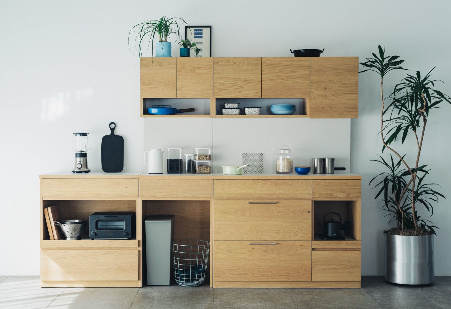 ダイニングはunicoでは初のセミオーダー式を採用。天板のサイズは7種類、脚は3種類と計21通りの組み合わせが可能で、ライフスタイルに合わせて選べます。チェアはお客様からの要望が多かった、お掃除ロボットが使いやすい、テーブルに引っ掛けられる仕様に。キッチン収納はお部屋のサイズや用途に合わせて16通りから選べるユニットタイプ。十分な収納力がありながら、白色のバックパネルと側板を無くすことで、圧迫感を最小限に抑えたデザインに。