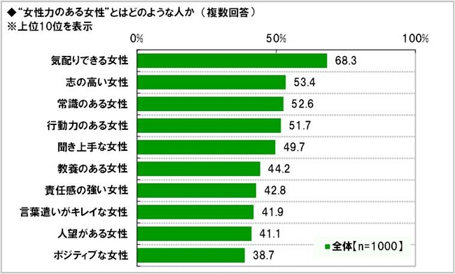 “女性力のある女性”とはどのような女性だと思うか聞いたところ、「気配りできる女性」68.3%が最多で、「志の高い女性」53.4%、「常識のある女性」52.6%、「行動力のある女性」51.7%、「聞き上手な女性」49.7%となりました。
