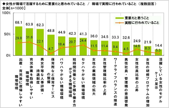女性ビジネスパーソンに女性が職場で活躍するためにどのようなことが重要だと思うか聞いたところ、「出産・育児後に復帰しやすい職場環境」68.1%が最多となり、「育児休業を取得しやすい職場環境」63.9%、「男女平等な人事評価・待遇制度」62.3%、「保育所など保育サービスの整備」48.8%、「パワハラがない職場環境」44.9%が続きました。また、 “重要だと思うこと”と“実際に行われていること”の差分をみると、ギャップが大きかったのは「保育所など保育サービスの整備」44.1ポイント、「男女平等な人事評価・待遇制度」40.2ポイント、「出産・育児後に復帰しやすい職場環境」38.3ポイント、「育児休業を取得しやすい職場環境」32.3ポイントでした。