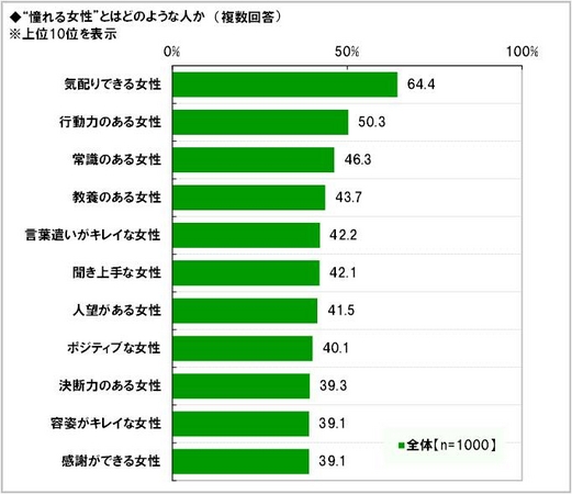 “憧れの女性”はどのような人か聞いたところ、「気配りできる女性」64.4%が最多となり、「行動力のある女性」50.3%、「常識のある女性」46.3%、「教養のある女性」43.7%、「言葉遣いがキレイな女性」42.2%が続きました。