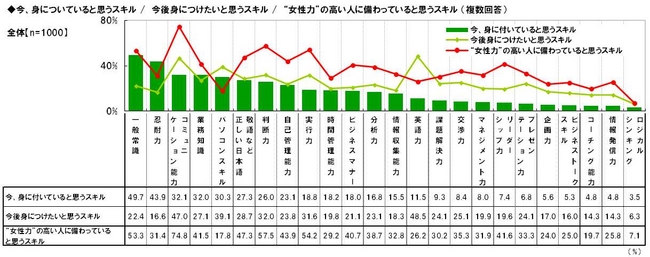 ◆女性ビジネスパーソンが“今、身についていると思うスキル”は「一般常識」(49.7%)が最多、