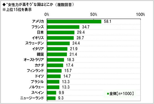 次に、『女性力とは、社会や組織などの中で活躍する女性の力のこと』と定義した上で、“女性力が高そうな国”を聞いたところ、「アメリカ」58.1%が最多となり、「フランス」34.7%、「日本」29.4%、「イギリス」28.7%、「スウェーデン」24.4%が続きました。