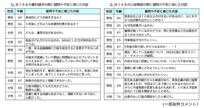 アンケートの終盤では、NISAの資料請求や口座開設をした際に、疑問や不安を感じた内容を、自由回答形式で聴取しました。その自由回答のコメントを細かく見ていくと、資料請求や口座開設をした場合であっても、