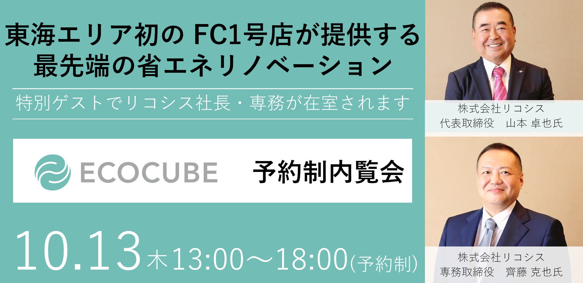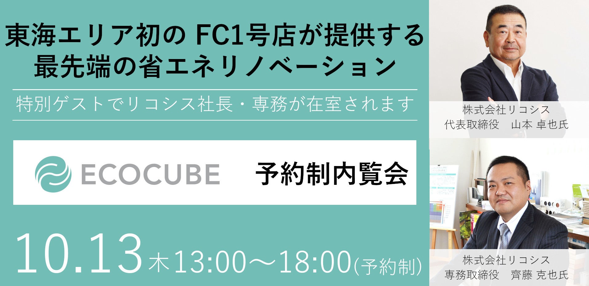 当日は「エコキューブ」事業を展開する株式会社リコシスより代表取締役と専務取締役をゲストに迎えますので、この機会に省エネリノベーションについて詳しくお聞きください。