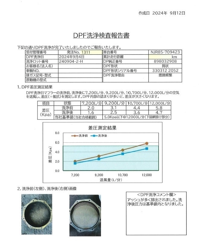 ・数値測定 → 洗浄 → 再測定の工程により、確実な性能回復を実現(純正フィルターのまま)