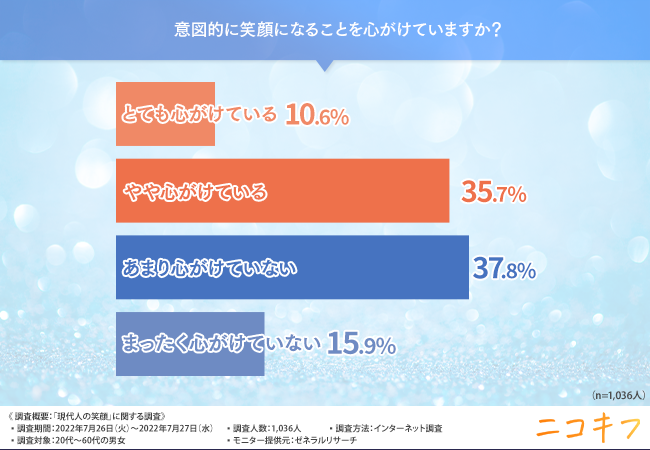 そこで「意図的に笑顔になることを心がけていますか?」と質問したところ、『とても心がけている(10.6%)』『やや心がけている(35.7%)』『あまり心がけていない(37.8%)』『まったく心がけていない(15.9%)』という回答結果になりました。