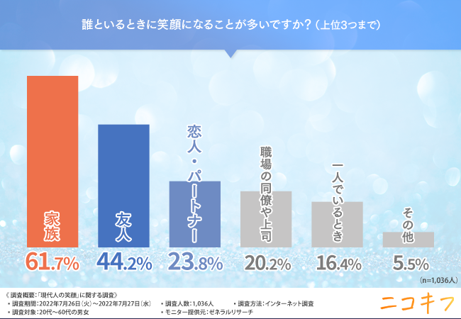 「誰といるときに笑顔になることが多いですか?(上位3つまで)」と質問したところ、『家族(61.7%)』と回答した方が最も多く、次いで『友人(44.2%)』『恋人・パートナー(23.8%)』『職場の同僚や上司(20.2%)』『一人でいるとき(16.4%)』と続きました。