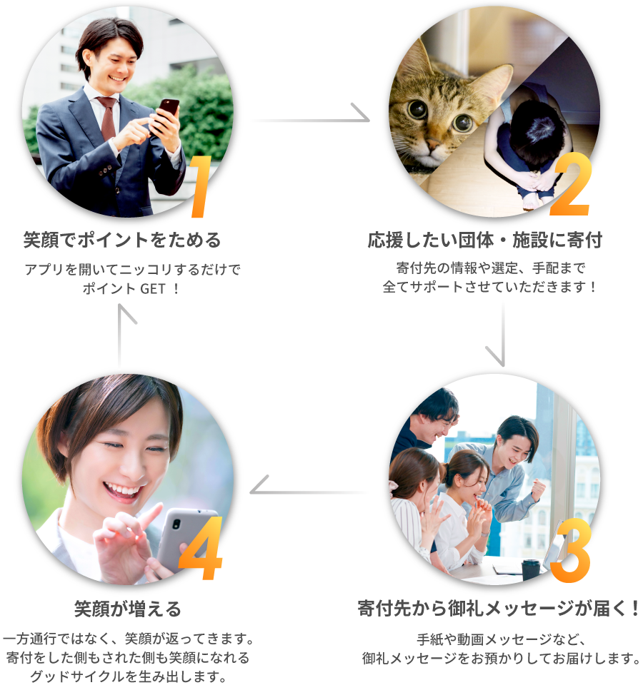笑顔で貯めたポイントが寄付出来る「笑顔アプリ」で世界中の笑顔を増やし、その笑顔で学校(企業)と地域を繋げます