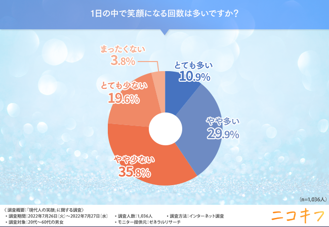 「1日の中で笑顔になる回数は多いですか?」と質問したところ、『とても多い(10.9%)』『やや多い(29.9%)』『やや少ない(35.8%)』『とても少ない(19.6%)』『まったくない(3.8%)』という回答結果になりました。