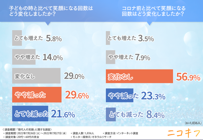 「続いて、「子どもの時と比べて笑顔になる回数はどう変化しましたか?」と質問したところ、『とても増えた(5.8%)』『やや増えた(14.0%)』『変化なし(29.0%)』『やや減った(29.6%)』『とても減った(21.6%)』という回答結果になりました。