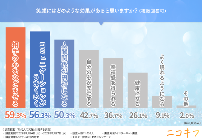 「笑顔にはどのような効果があると思いますか?(複数回答可)」と質問したところ、『相手の心をなごませる(59.3%)』と回答した方が最も多く、次いで『コミュニケーションがうまくいく(56.3%)』『人間関係が円滑になる(50.3%)』『自分の心が安定する(42.7%)』『幸福感を得られる(36.7%)』『健康になる(26.1%)』『よく眠れるようになる(9.1%)』と続きました。