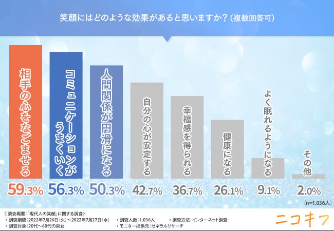 『相手の心をなごませる』『コミュニケーションがうまくいく』『人間関係が円滑になる』と回答した方が半数以上と多く、自分だけでなく相手に対しても良い効果があると感じている方が多いようです。